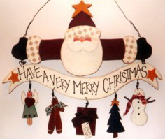 house. Make it the opening act on your front door this Christmas. Santa is approximately 15" tall by 16" wide. This wall hanging comes with five ornaments.....$ 46.00.